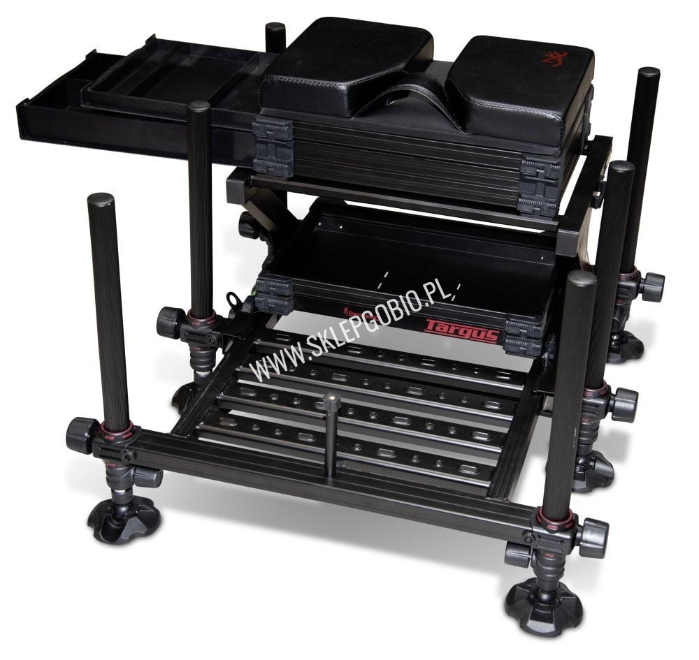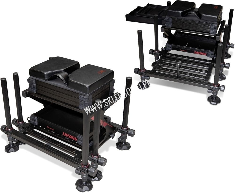 Siedzisko Targus ma zamocowaną na stałe ramę dla maksymalnej wytrzymałości i stabilności podczas łowienia. Rozszerzana, wsuwana platforma na stopy sprawia, że siedzisko jest szersze, dzięki czemu jest bardzo stabilne na nierównym gruncie i przeznaczone jest dla cięższych wędkarzy. Nogi o średnicy 36mm są całkowicie teleskopowe i zawierają duże ruchome stopki. System nóg i ramy został tak zaprojektowany, aby chronił przed zsunięciem się siedziska. Siedzisko można używać z wysuniętymi nogami, co jest idealne gdy łowimy np. z brzegu jeziora. Niższa rama zawiera tackę szczelinową, która tworzy przestrzeń użytkową do przechowywania np. przynęt podczas łowienia.Siedzisko zawiera 1 szufladę 3 cm i 1 szufladę 6cm otwieraną z boku z wewnętrznymi separatorami. Dostępne są dodatkowe kasety, szuflady i inne akcesoria.