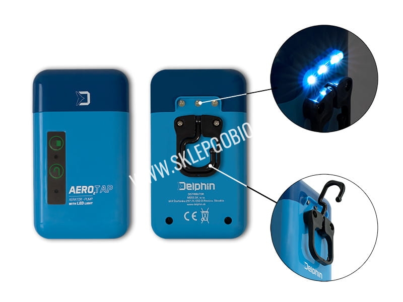 Jeśli używasz AeroTAP jako pompki, wytrzymuje ona 2 godziny non-stop. W pakiecie znajduje się fajka, filtr i kamień napowietrzający dla dokładnego natleniania wody. Uniwersalny gwint na spodzie pozwala na zamocowanie jej na różnych bankstickach. Znajdujące się z tyłu diody pozwalają na używanie jej nawet przy słabej widoczności. Pomogą również przy oświetleniu miejsca zasiadki. Delphin AeroTAP to przydatne urządzenie dla każdego wędkarza, zarówno na dłuższą jak i krótszą zasiadkę.