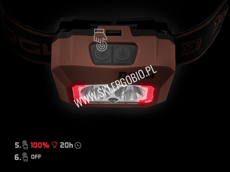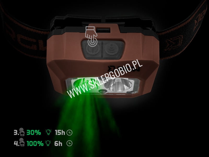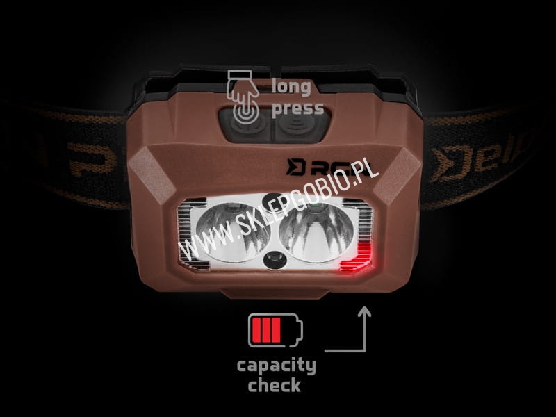Oryginalna, wyrafinowana czołówka marki Delphin, która oferuje kilka świetnych funkcji i moc 5W przy jasności 200lm. RWG PRO posiada czujnik ruchu i trzy kolory światła, w tym klasyczne białe światło, a także zielony i czerwony kolor światła. Po pierwszym kliknięciu czołówka świeci do 30% mocy i działa do 10 godzin. Po drugim kliknięciu zapala się do 100% na 4 godziny. Po trzecim kliknięciu kolor światła zmienia się na zielony z intensywnością 30% i doskonałą trwałością do 15 godzin. Po czwartym kliknięciu zielone światło świeci na 100%, a przy piątym na 100% zapala się czerwone światło. To właśnie zielono-czerwone światło nie przyciąga irytujących owadów, co na pewno docenisz podczas walki z rybami, które są znacznie mniej wystraszone niż gdy oświetlone jest białym światłem. Czujnik ruchu można aktywować drugim przyciskiem, wystarczy więc pomachać przed czujnikiem dłonią, aby włączyć lampkę. Niewątpliwą cechą jest wskaźnik pojemności baterii, który zapala się na czołówce po dłuższym przytrzymaniu przycisku włącznika. Baterię o pojemności 1500 mAh można naładować za pomocą kabla USB ze złączem micro, pełne naładowanie zajmuje 4,5 godziny.