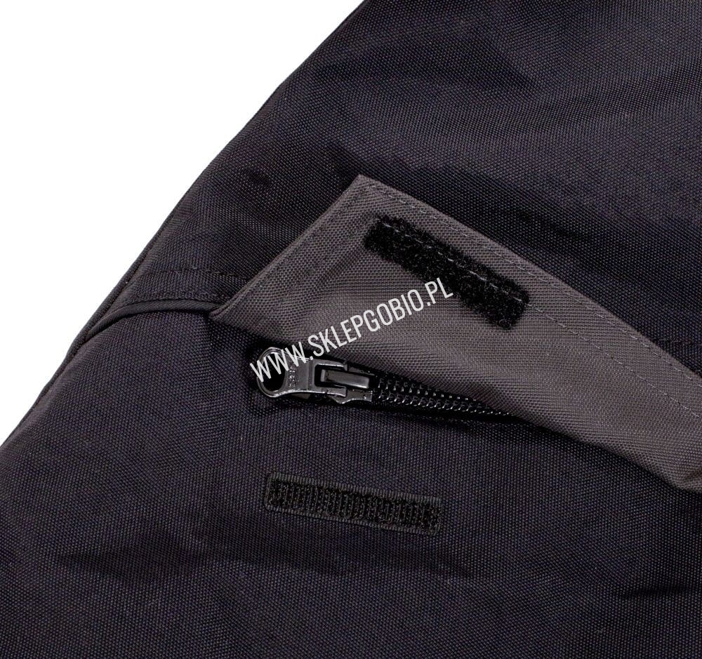 Spodnie posiadają dodatkowe wzmocnienia na kolanach i siedzeniu oraz dwie kieszenie zapinane na solidne zamki. Nogawki są poszerzane, a dzięki regulacji za pomocą rzepów, w większości przypadków, możemy spodnie zakładać bez zdejmowania obuwia.