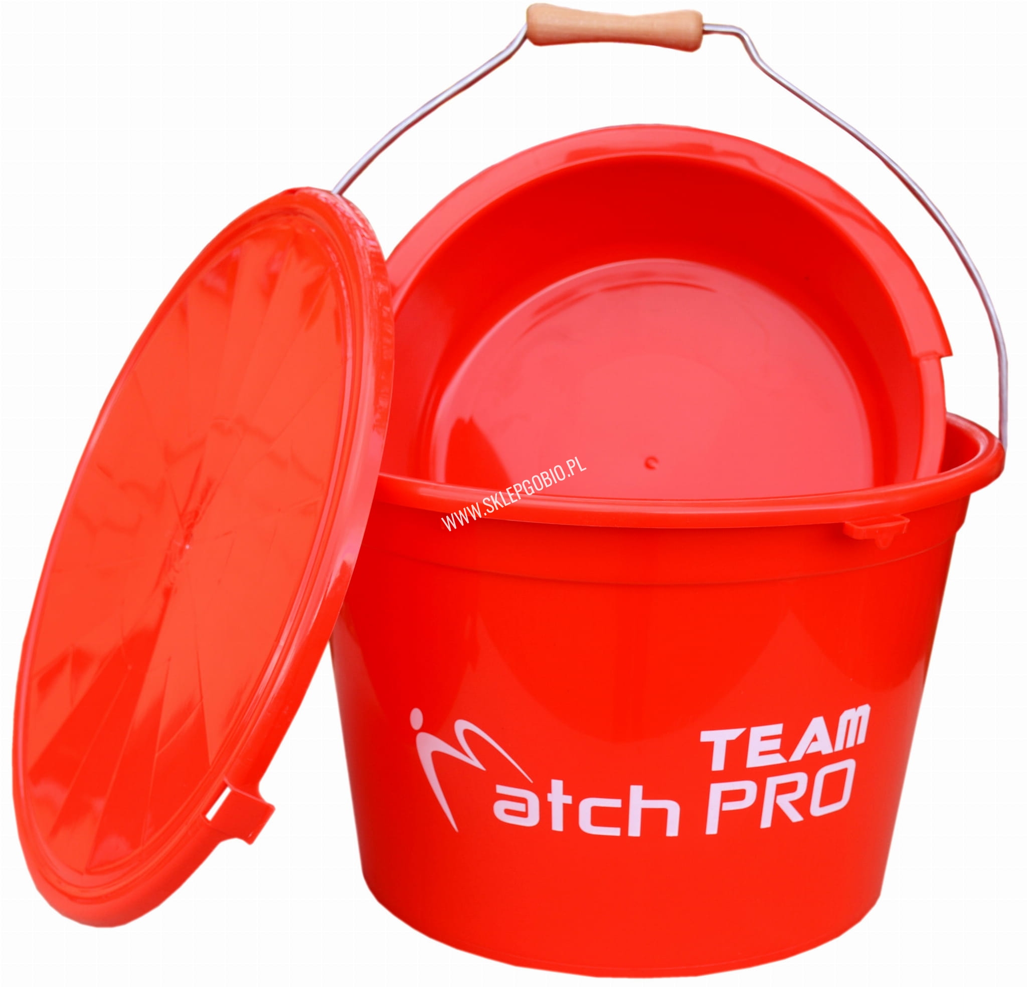 Wiadro firmy Matchpro o pojemności 25l z miską i przykrywką w kolorze czerwonym z podziałką.